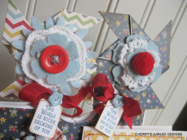 As I said I couldn't stop there....I stitched up a pocket using matching papers and decided to use one of my pinwheels as center stage on the pocket. I wrapped some yummy chevron twill in light blue around the pocket and made a double bow. I wanted to add some more texture to the bottom and so I added some Camille crochet lace and pom pom trim. I also made a matching card and simple little bicycle tag using more red seam bindings as well as some bakers twine. I am calling it a happy pappy pocket with happy pappy pinwheels...why??? I don't know...I just like the name and I just like saying it! Works for me..lol.....anyways..I hope you enjoy! hugs, cherry