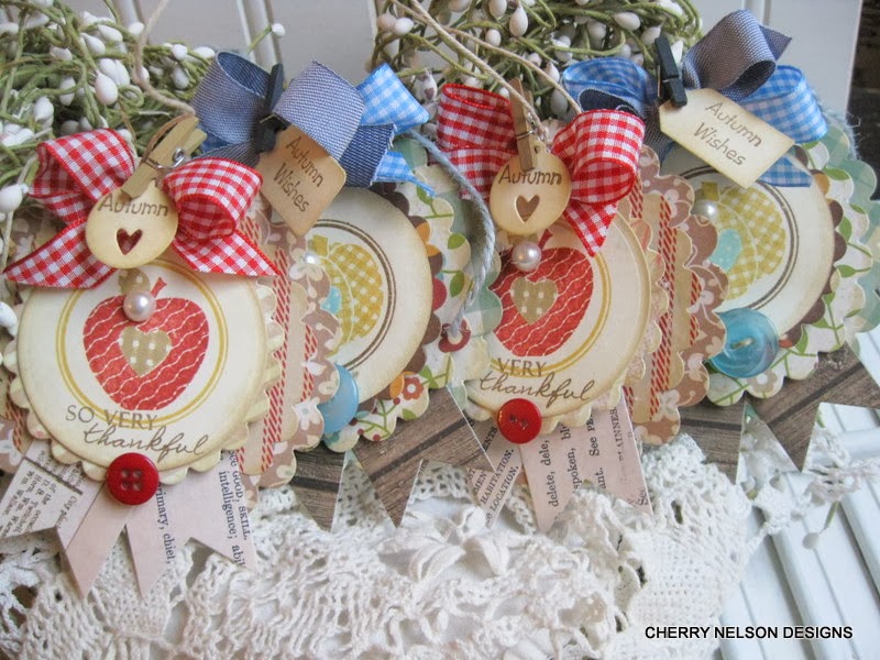 Hi there! Got some fun little fall tags to share today for RRR. Again using my spell binder dies, I just did a heap of layering. I used stamps from Wplus9 and Purple Onion. I love prim or country style stamps...I never tire of them. To me they never go out of style. I mixed it up with my ribbons using 3/8 red gingham, blue denim ribbon, and 3/8 blue gingham. I also used the Jute string in light blue . This would be cute as a little hostess gift for Thanksgiving or change them up for place cards! Enjoy, Cherry