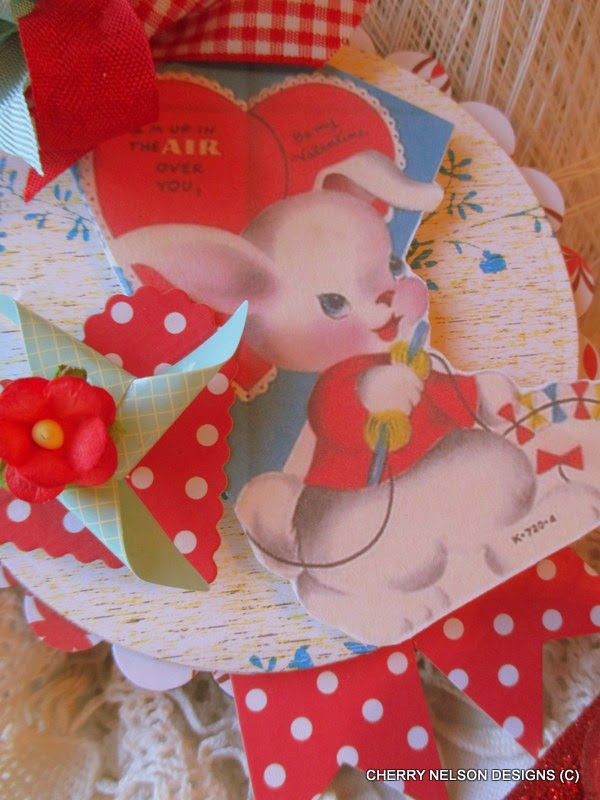 Having fun with all kinds of kitschy today! Love these old animal valentines like we use to get when we were little. I made these up using RRR ribbon. Lots of reds and aquas thrown in. I love to fussy cut the images and use foam adhesive to bring each image to life. layering as I go....using sweet sweetheart blossoms. I used lipstick red and bay leaf seam bindings, and red gingham ribbon. Hope you enjoy, cherry