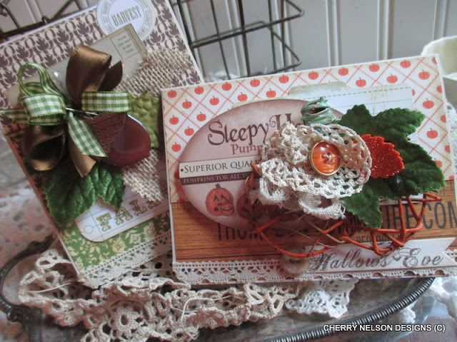 I can feel Autumn coming. Can you? It is getting colder in the mornings here. With Fall coming on, it is the perfect time to start in on those seasonal cards. We have the perfect challenge over at the RRR blog for that. I created two cards since I missed out on the RRR blog hop. The first one I have ever missed. I used several ribbons from this month's ribbon club. I used the plaid ribbon in moss/cream , satin with grosgrain edge in turftain brown, and Debra Natural Crochet lace. I also used a bit of 2 1/2 cotton blend in plain that I ripped up into small widths to embellish my grapevine pumpkin. I love Fall colors, they inspire me! Hope you enjoy and check out all the girl's inspiration! hugs, cherry